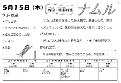 しょうが汁・にんにく・コチジャン・ごま油などで下味をつけた牛肉、玉ねぎ・にら・しょうがなどを混ぜ合わせた「プルコギ」、焼き豚も入った「とうふとわかめのスープ」、「さんどまめのナムル」、「ごはん」などをおいしくいただきました。