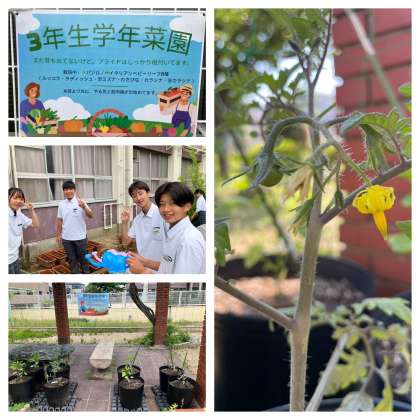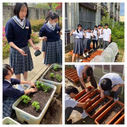3年生は4月から探究学習の一環として、『農業×ビジネス×クリエイティブ』をテーマに、本気で《食》と向き合い、未来の食文化を創造するプロジェクト、《地産地消クリエイティブチャレンジ》を進めています。現在そのスタートとして、ベビーリーフ・バジル・ピーマン・中玉トマトを学校で育てています。
