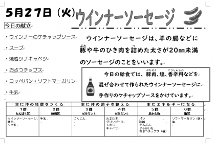 「コッペパン・ソフトマーガリン」、「ウインナーのケチャップソース」、ワインで下味をつけた鶏肉・じゃがいも・たまねぎ・にんじん・グリンピース・しめじなどを煮た「スープ」、「焼きツナキャベツ」、「おさつチップス」などをおいしくいただきました。