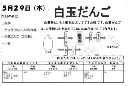 料理酒で下味をつけた豚肉、糸こんにゃく・玉ねぎ・にんじん・青ねぎなどがたっぷりな「豚丼」、「きゅうりのかつお梅風味」、「白玉だんご(きな粉)」などをおいしくいただきました。