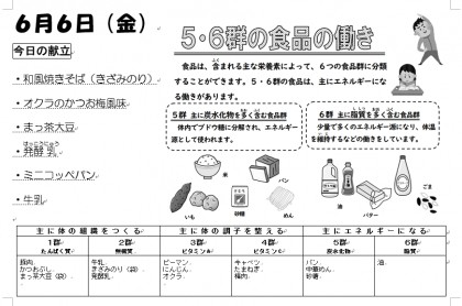 「ミニコッペパン」、豚肉・キャベツ・たまねぎ・にんじん・ピーマンがたっぷりの「和風焼きそば」、「きざみのり」、「オクラのかつお梅風味」、「まっ茶大豆」、「発酵乳」などをおいしくいただきました。