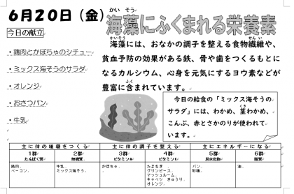 「おさつパン」、ベーコン・たまねぎ・グリンピース・マッシュルームも入った「鶏肉とかぼちゃのシチュー」、「ミックス海そうのサラダ」、「オレンジ」などをおいしくいただきました。