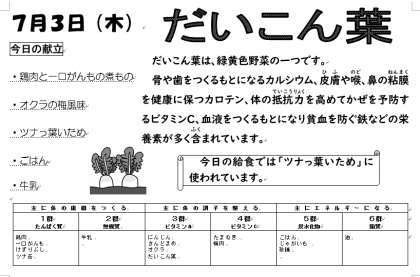 「ごはん」、じゃがいも・玉ねぎ・にんじん・三度豆などもたっぷりの「鶏肉と一口がんもの煮もの」、「オクラの梅風味」、ツナと大根葉をいためた「ツナっ葉いため」などをおいしくいただきました。