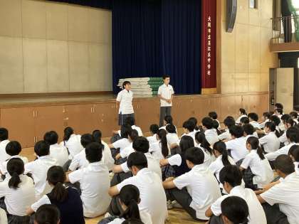 今日も暑い一日でした。3年生は朝に学年集会がありました。毎回3年生は委員長からの話、今週のスピーチの担当からの話等、司会も含めて、自分たちで運営をしています。今日は代表生徒から7月9日(泣く日)についての話と、継続についての話がありました。今回はそれに加えて先日全国大会出場を決めた陸上部の2人が、これまでの思いや大会に向けての意気込みを語ってくれました。どの人の話もみんな真剣に聴けていました。同じ学年の仲間の話に刺激を受けて、お互い高め合っていってください。