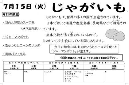 「黒糖パン」、野菜は玉ねぎ・キャベツ・にんじん・むき枝豆・マッシュルームなどがたっぷりの「鶏肉と野菜のスープ」、「ジャーマンポテト」、「きゅうりとコーンのサラダ」などをおいしくいただきました。