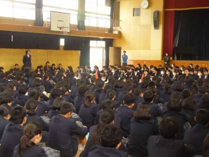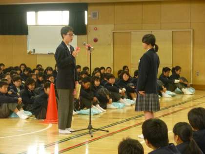 今日7日(月)6時間目、体育館で、生徒会主催による「3年生お別れ会」が行われました。