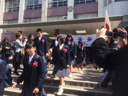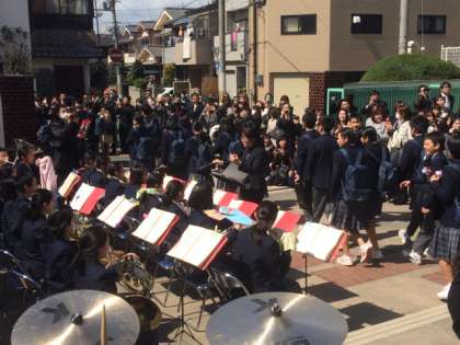 ホームルームの後、正門では吹奏楽部の演奏の中、さらに多くの、在校生、保護者の方、教職員が見送りをしました。