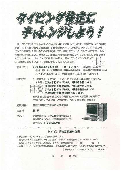 パソコン部では、パソコン検定にチャレンジしていますが、部員以外の人にも、無料のタイピング検定の場を設けています。