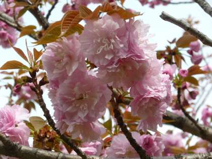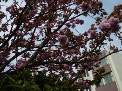 校門の大きなソメイヨシノがこの前、満開を迎えたのに続き、学校園、藤棚横のサトザクラ(八重)が満開を迎えました。