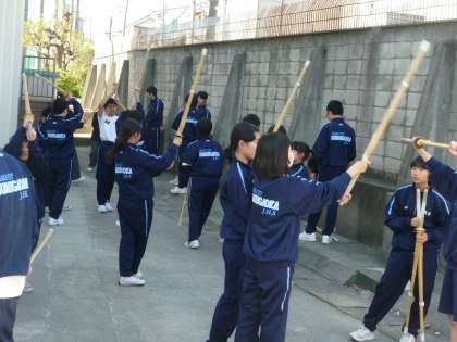 剣道部は、屋外で素振り、打ち込みを教わっていました。