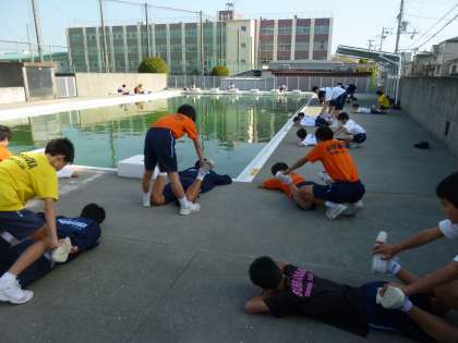 水泳部は、プールサイドで体力トレーニングを行っています。明日は、室内プールで2,3年生は練習です。