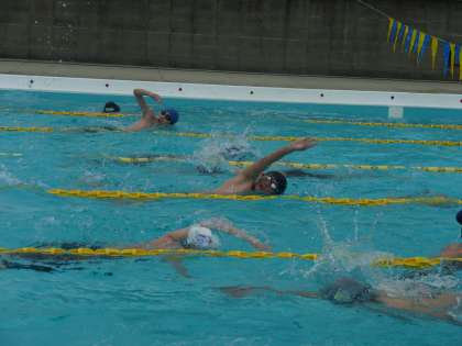「プール開きと泳ぎ初め」です。選手の人たちは待ちかねたように、気持ちよく泳ぎ初めを楽しみました。