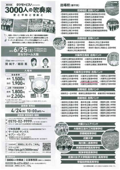 吹奏楽部では、来る6月25日(土)京セラドーム大阪で開催されます、「第56回3000人の吹奏楽」に大阪市立中学校合同バンドメンバーとして、出演します。