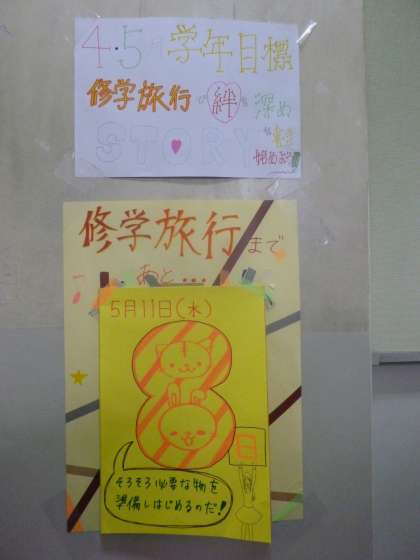 3年生の廊下には、「修学旅行直前準備」でいろいろなポスターが制作、掲示され盛り上がってきています。