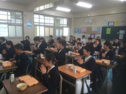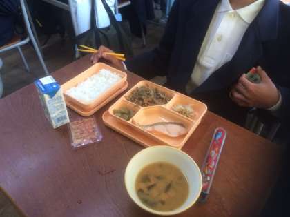 今日の給食メニューは、「鮭の塩焼き」「きんぴらごぼう」「もやしのゴマ和え」「ふきの青煮」、そして「みそ汁」が付きました。