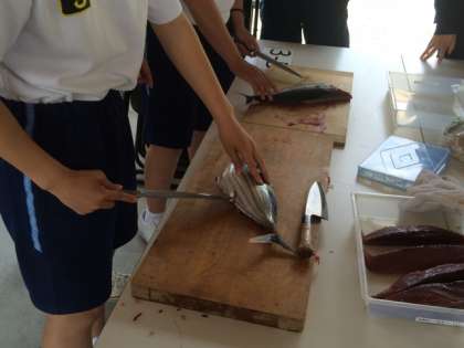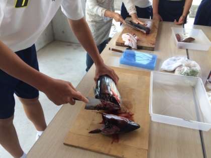 説明を受けて、いよいよカツオを丸ごと捌(さば)いて行きます。