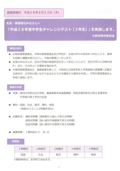 画面1 『生徒・保護者のみなさんへ「平成28年度中学生チャレンジテスト(3年生)を実施します。』