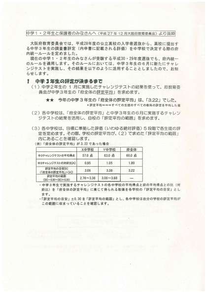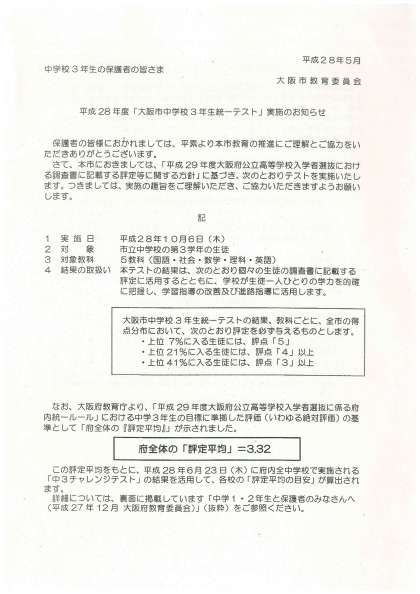 画面2 『平成28年度「大阪市中学校3年生統一テスト」実施のおしらせ』