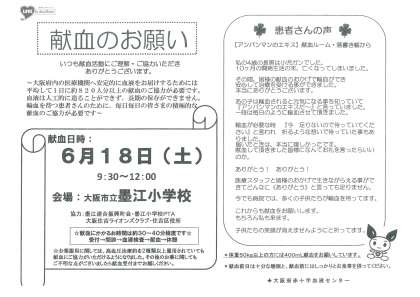墨江小学校PTAでは、来る6月18日(土)9:30〜12:00、「献血活動」を行われます。