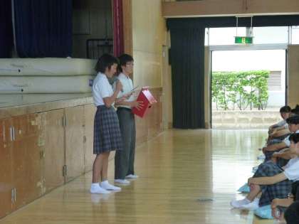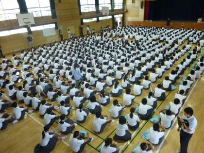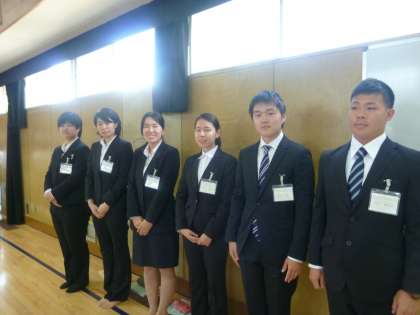 集会では、今日から始まる教育実習について話があり、実習生が一人一人、紹介されました。