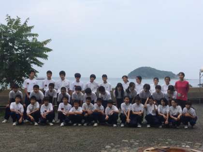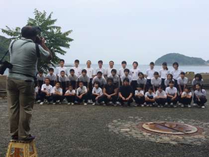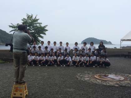 今朝、沖の無人島をバックに各クラスの写真を撮りました。