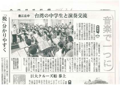 去る7月4日(月)本校吹奏楽部が行った、台湾介壽国民中学との国際交流演奏会の様子が、今日6日付、大阪日日新聞で大きく記事で、紹介されました。