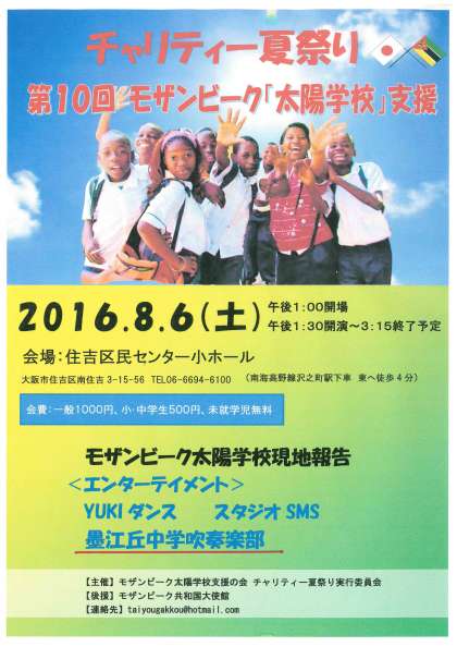 吹奏楽部では、この8月6日(土)、住吉区民ホールで行われます、モザンビークの学校建設を支援するチャリティイベントに協力出演します。