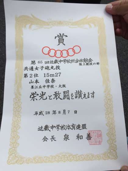 和歌山県紀三井寺で行われています、陸上の近畿大会に出場しています、山本選手は7日、女子砲丸投げ決勝で、15m27を記録し、見事、近畿2位に入りました。