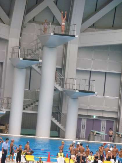 今日は、女子選手が、こんな高い所からの飛び込みを練習していました。