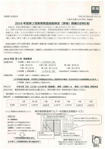 秋の英語検定(2016年度第二回)英語検定の受付と実施のお知らせプリントが配布されました。