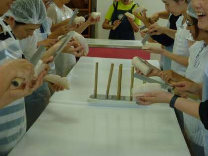 練りこまれたさかなのすり身を、木の板に張り付けて行きます。