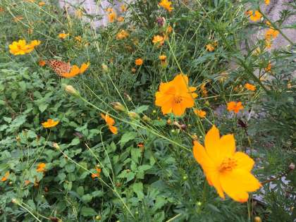 正門横の学校園では、キバナ(黄花)コスモスが満開を迎えています。