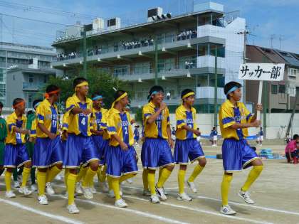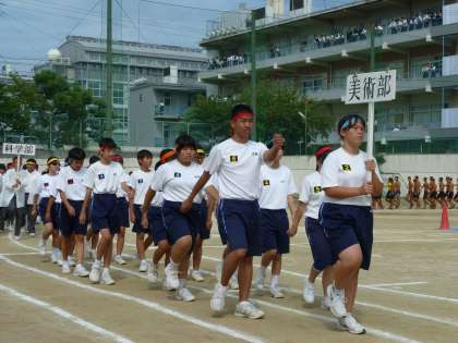 それぞれのクラブが、工夫を凝らして行進します。楽しいひと時です。吹奏楽部に続いて、最初はバドミントン部で今年も好調で、大阪市チャンピオンを生まれました。サッカー部、春の大会からずっと休みなしで戦い続けています。そして今、文化祭準備に余念がない美術部です。