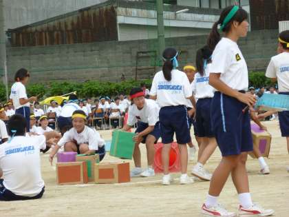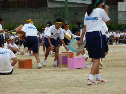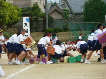 続いて行われたのは、生徒会種目です。これは真ん中に置かれた段ボール箱を宅急便のように運び、取り合うもので、それぞれ点数が入って行きます。