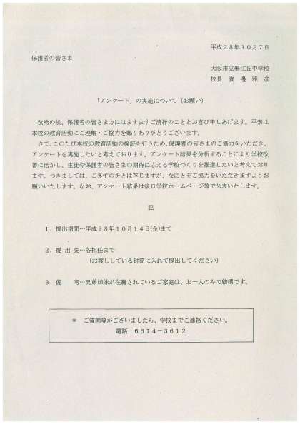 本校では、この時期に「学校アンケート」を実施しています。対象は生徒の皆さん、保護者の皆さん、そして教職員自身です。保護者の皆さんには、次のようなアンケートをお願いしています。締め切りは過ぎましたが、もしまだ未提出の方がありましたら担任まで至急、ご提出ください。学校への率直なご意見をお待ちしております。
