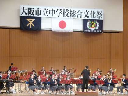 吹奏楽では、「大阪市立中学校総合文化祭」の舞台発表の部に出演しました。会場は鶴見区民センターです。今日は市内中学校6校の吹奏楽部の発表がありました。