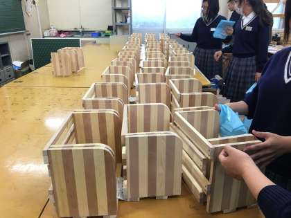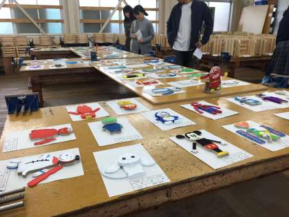 午後からは、展示発表見学に移りました。順に写真で紹介します。まず教科、技術科の授業製作、「動くオルゴール」と「本立て」です。そして科学部の研究発表です。