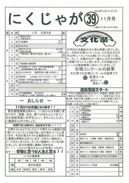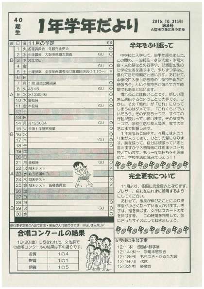 11月の各学年だよりが、発行されました。今月は、5日(土)が土曜授業日、14日(月)から3年生が進路懇談、22日(火)から2学期末テスト(全学年)が始まります。
