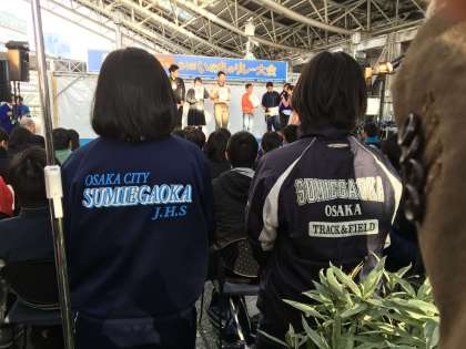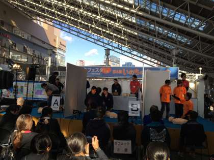 JR西日本あんしん財団が主催する「いのちのリレー大会」の第4回大会が大阪駅時空(とき)の広場で開催されました。これは「救命救急措置の技術を競うコンテスト」で、今回は20チームが参加しました。また、応援の皆さんや保護者の方がも駆けつけてくれました。