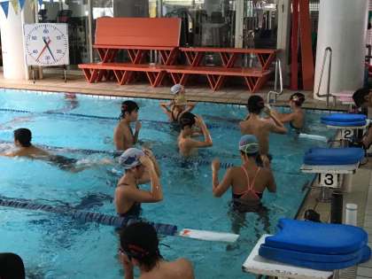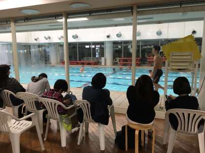 今日は、室内練習の様子を、保護者の方々にも直接見学できるように顧問で準備いたしました。早速の保護者の皆さまには、お越しいただき熱心に参観いただきました。子どもたちも気持ちよさそうに泳いでいます。