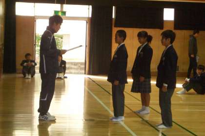 1年生では、本日金曜日、定例の学年集会です。今日は、文化祭で行われた「壁新聞コンクール」の表彰が行われました。