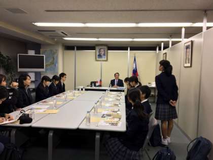 今日29日(火)放課後、今年の台湾学校交流の派遣メンバー9名は引率の先生とともに「台北駐大阪経済文化弁事処(台湾領事館)」を表敬訪問し、出発のあいさつを羅文化教育課長(領事)さんに行いました。一人一人が抱負を大きな声で述べ、領事さんからもお褒めの言葉と激励をいただきました。