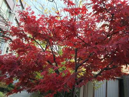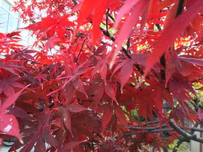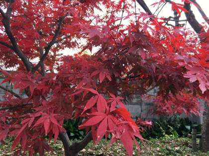 12月に入って、紅葉(もみじ)が真っ赤に色づき始めました。夕日を浴びて、見事な色映えを放っています。