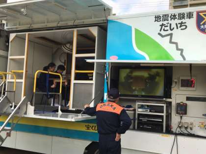 区役所東側の沢ノ町公園では、本格的な防災体制の訓練が行われていました。仮設トイレ、地震体験車、給水訓練、土嚢準備作業など、実際に行われました。