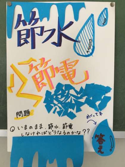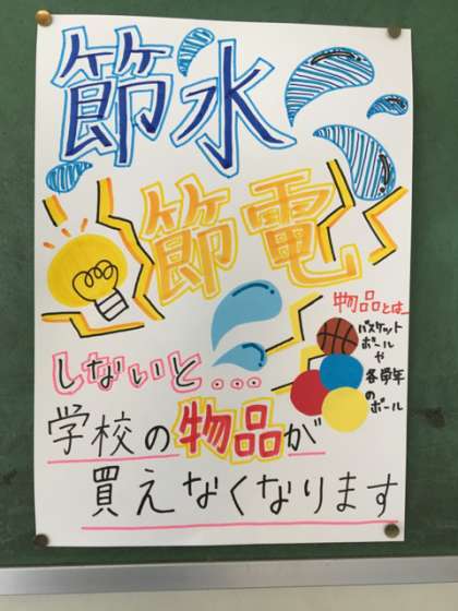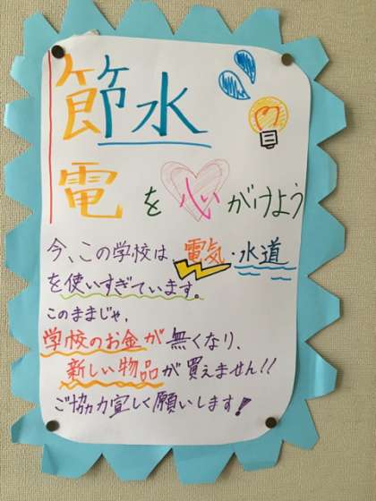 ある時、生徒会の役員の人たちが先生から、学校の予算には限りのあることを聞かされました。そうすると、ほんとうに欲しいものやみんなが使うものがも買えなくなったりすることを知りました。そこで普段からできる節約を呼び掛けることになったものです。校内のあちらこちらにポスターが貼られ、誰もが意識できるようになっています。
