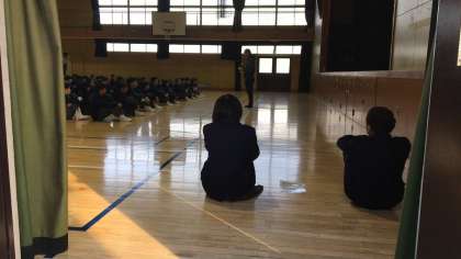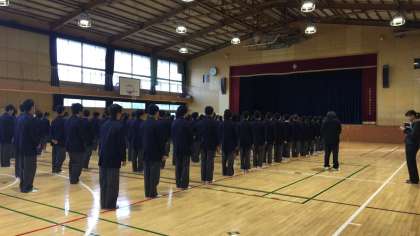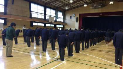 金曜日、1年生の学年集会が始まりました。静まり返った体育館で、8時25分、学年代表の号令がかかりました。