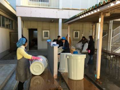 今日は早朝から、PTA、丘友会の皆さんが、いよいよ明日に迫った今年の「もちつき・かるた大会」の準備にあたられました。杵や臼などすべての物を寒い中水洗いされ、また調理室では食材の仕込みをされました。本当にありがとうございます。