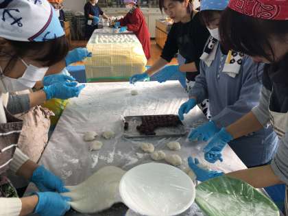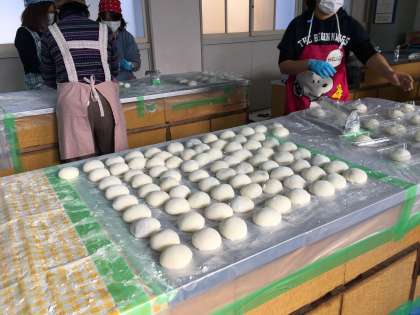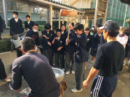 今日、2時間目の授業終了後、「もちつき大会」が始まりました。すでに、昨日から準備が始まり、今日も早朝からもち米の仕込みなど、PTA、丘友会(後援会)の皆さまが準備にあたられました。