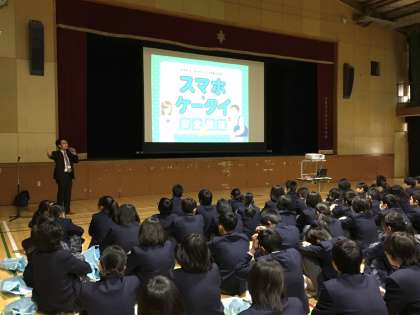 終業式に続いて、体育館では、これからの冬休みに向けて、正しい携帯電話の使い方を学ぶ、「スマホ、ケイタイ安全教室」が行われました。講師はNTTドコモから来ていただきました。実際に起こった実例を中心に、判りやすくお話いただきました。