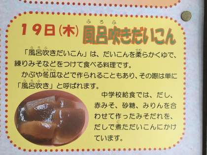 今日の給食は、冬のこの時期好んで食べられる「風呂吹きだいこん」です。大根を柔らかく煮込んだ料理で、味がしみ込んだ美味しいおかずです。